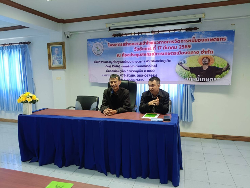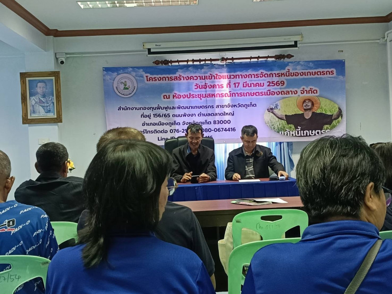 วันอังคารที่ 17 มีนาคม 2569 เวลา 09.00 น. นายธีรยุทธ ชุมนวล สหกรณ์จังหวัดภูเก็ต มอบหมายให้ นางสาวสุมนา ณ นคร นักวิชาการสหกรณ์ชำนาญการ นายธนเดช สมบัติ ตำแหน่งนักวิชาการสหกรณ์ชำนาญการ พร้อมด้วยนางกาญจนา ผุดผาด ตำแหน่ง นักวิชาการสหกรณ์ปฏิบัติการ เข้าร่วมโครงการสร้างความเข้าใจแนวทางการจัดการหนี้ของเกษตกร วัตถุประสงค์ เพื่อสร้างความเข้าใจแนวทางการจัดการหนี้ของเกษตรกรร่วมกับสถาบันเกษตรกร จัดโดย สำนักงานกองทุนฟื้นฟูและพัฒนาเกษตรกร สาขาจังหวัดภูเก็ต ณ ห้องประชุมสหกรณ์การเกษตรเมืองถลาง จำกัด ตำบลเทพกระษัตรี อำเภอถลาง จังหวัดภูเก็ต