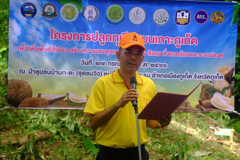 วันพฤหัสบดีที่ 27 กรกฎาคม 2566 เวลา 10.00 น. นายพิพัฒน์ นาคธรณินทร์ สหกรณ์จังหวัดภูเก็ต มอบหมายให้ นางสาวอารยา แก้วจำนงค์ นักวิชาการสหกรณ์ปฏิบัติการ และนางสาวสุดา พรหมทอง เจ้าพนักงานธุรการ เข้าร่วมโครงการปลูกทุเรียนบนเกาะภูเก็ต ปี 2566 ตามแนวคิดเพิ่มพื้นที่สีเขียว เพื่อให้เกิดความสมดุลทางเศรษฐกิจ สังคม สิ่งแวดล้อมและระบบนิเวศ และส่งเสริมเพิ่ม การปลูกทุเรียนเพื่อสร้างความมั่นคงทางอาหาร สร้างรายได้ นำไปสู่การพึ่งตนเองและการพัฒนาคุณภาพชีวิต ของประชาชนในจังหวัดภูเก็ต โดยกำหนดเป้าหมายดำเนินการปลูกทุเรียนบนเกาะภูเก็ตจำนวน 100,000 ต้น/เมล็ด โดยมี นายวิกรม โกมลตรี อัยการจังหวัดภูเก็ต เป็นประธาน ณ ป่าชุมชนกะรน อำเภอเมือง จังหวัดภูเก็ต